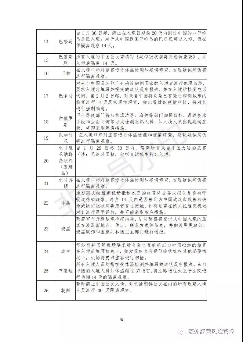 入境限制。多数国家和地区对中国籍人员采取的入境限制主要包括隔离14天,禁止入境,拒绝登机等。这些措施均会对在建项目和新开发项目产生一定的影响,对于建设中项目而言,部分中方管理人员或劳务人员回国过春节,入境限制使其无法返回项目所在国,影响项目的实施进度或者工厂经营管理;对于新开发项目而言,入境限制会影响相关人员对海外项目现场考察或投标、谈判。