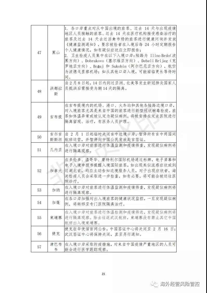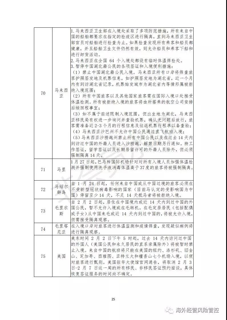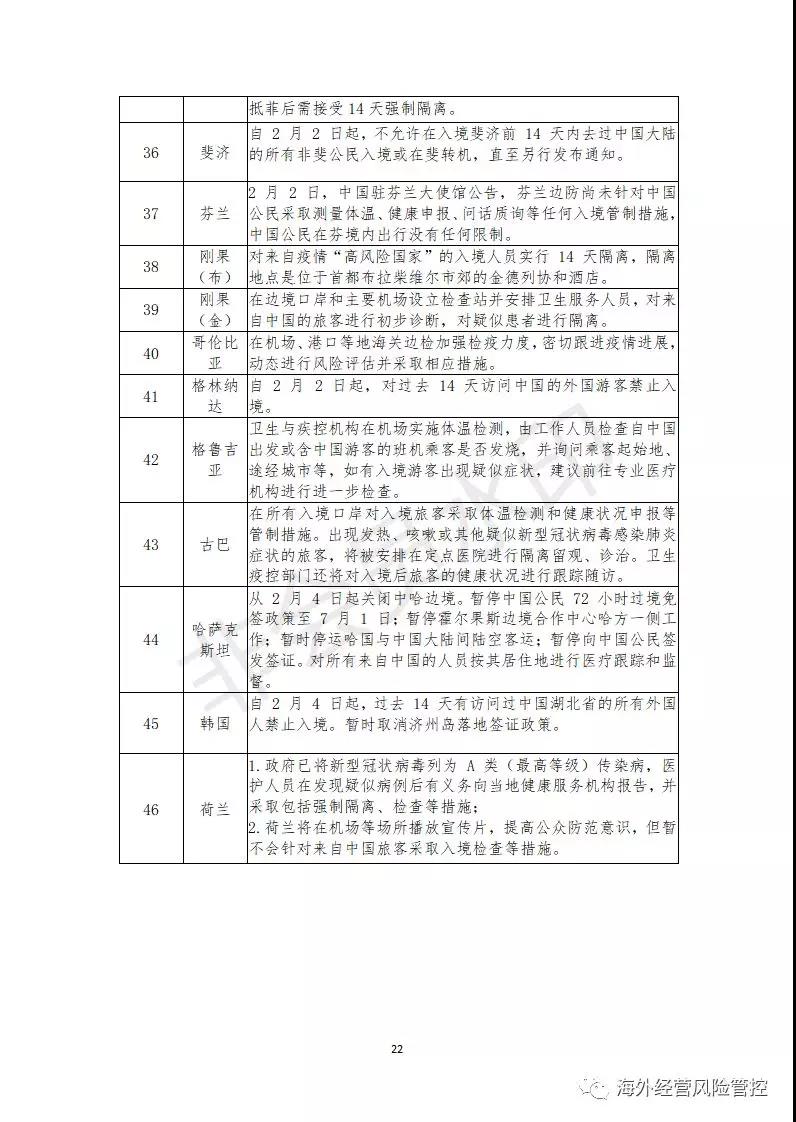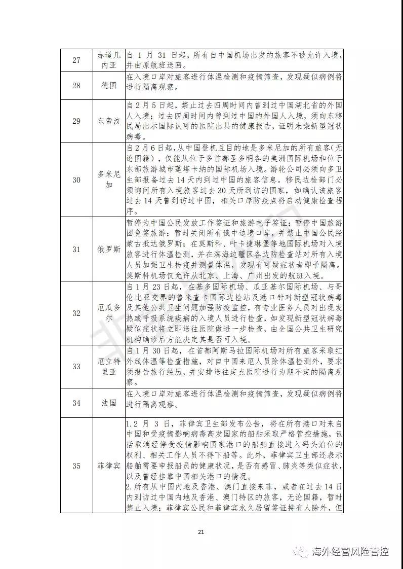 截至2月12日,已有131个国家和地区对中国籍人员采取了不同程度的入境管制措施,这些管制措施可能导致部分境外项目人员无法顺利通关入境,给企业的海外投资活动带来一定程度的劳务风险,具体包括以下几方面。