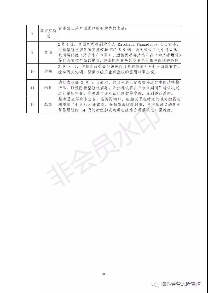 部分国家对来自中国的物资加强检疫,入境港口要求暂停、延期或拒绝入港等措施,导致物资延迟入关。而国内工厂由于疫情发生,暂缓复工,国内生产的建筑材料、生产物资等出口也将会受到延误。目前,共有12个国家实施了货物清关措施,具体见附表二。